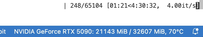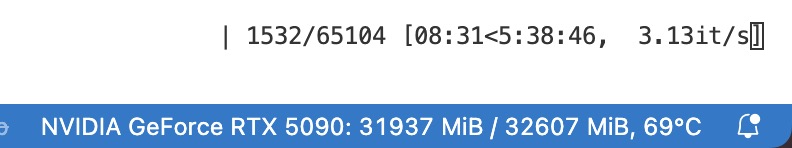 21 GBだとRTX4090でもそのまま走ります(mlp入りはout of memoryになった)。こちらもやってみると、2.76it/sで6h30minかかるということです。RTX5090のほうが44%速いです。